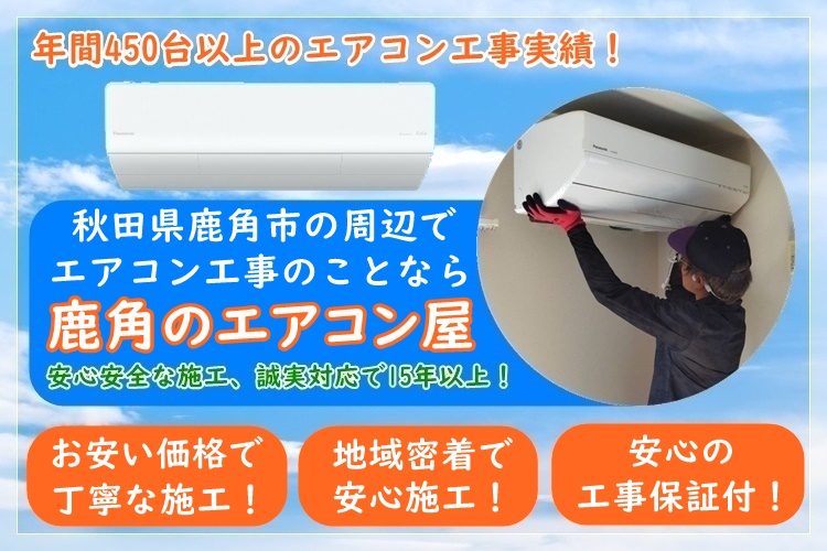 鹿角のエアコン屋は家庭用のエアコン工事を主にエアコン取り付け・取り外し工事をおこなっている地域密着のエアコン工事業者で、鹿角市を中心に秋田県で活動しております。